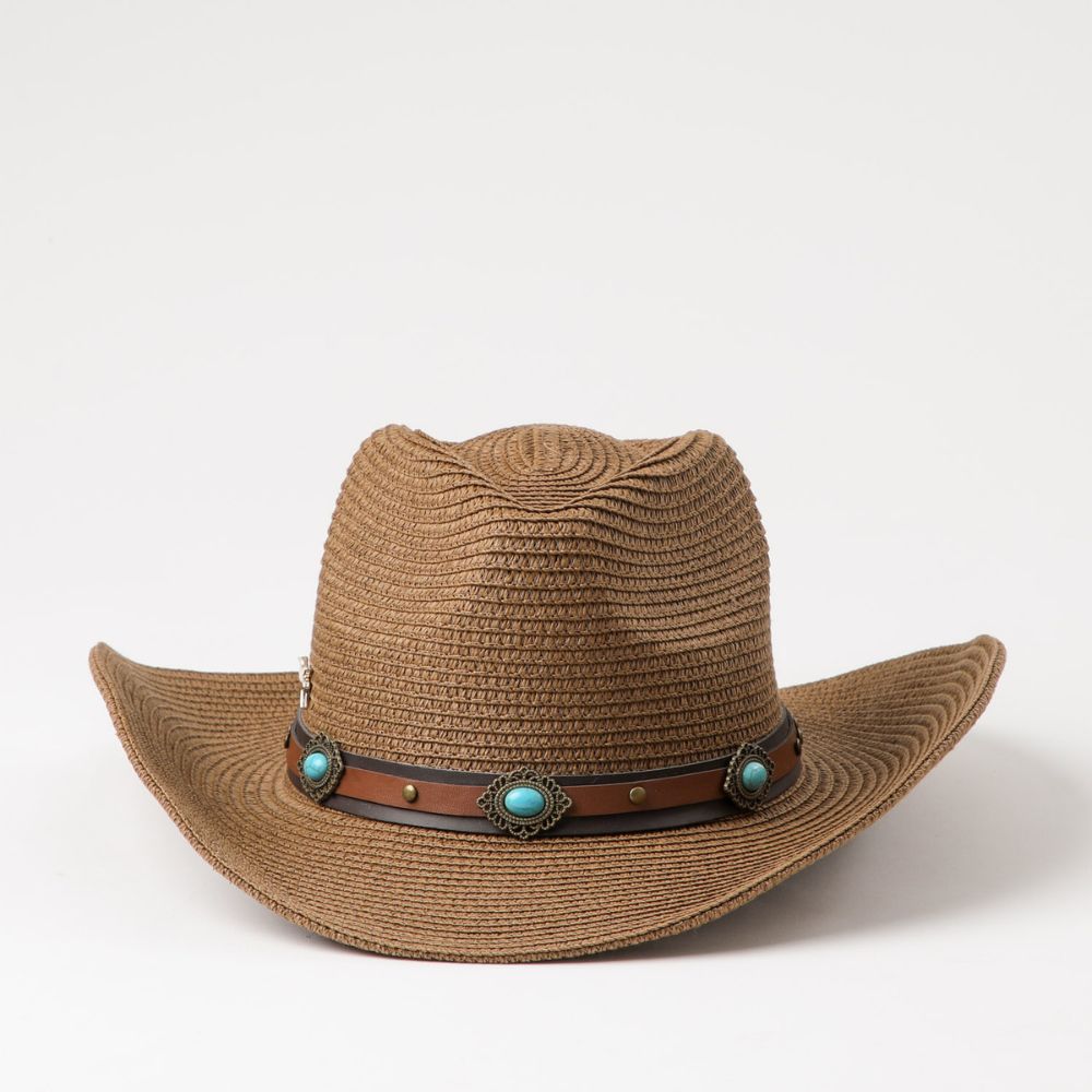 Sombrero café ala media con icono de la marca cosido al lado. Tiene una doble banda de ecocuero con tachas doradas y apliques turquesa. Tiene una cinta dentro que permite el ajuste a la cabeza.