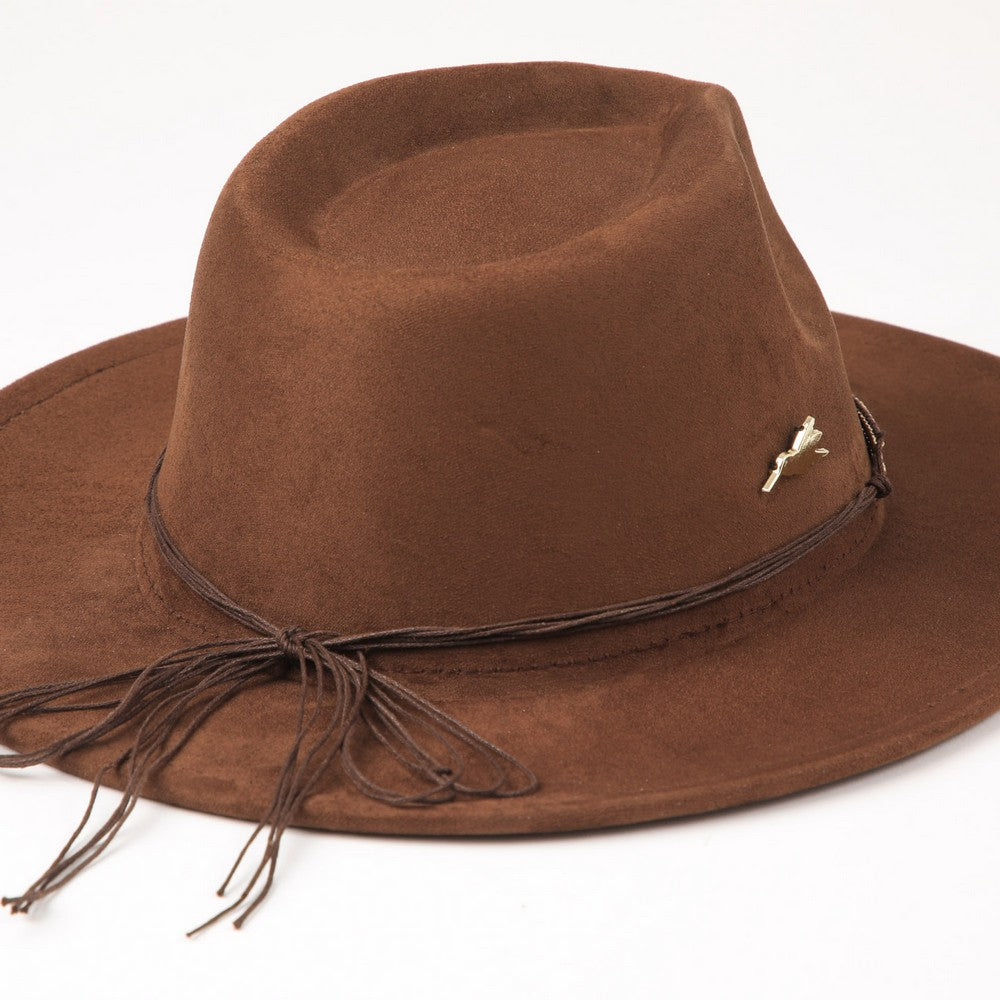 Sombrero color café. Lleva cinta delgada alrededor de la copa con cordones decorativos y detalle metálico lateral. Un accesorio práctico para el día a día.