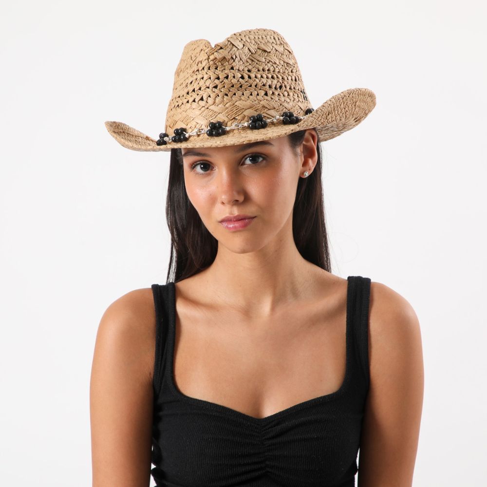 Sombrero beige estilo cowboy, su copa y alas de hebras trenzadas, y una "H" metálica cosida al costado. Tiene una correa de cuerdas blancas y grupos mostacillas negras con mostacillas plateadas intercaladas. Dentro tiene un elástico negro para ajustar a la cabeza.