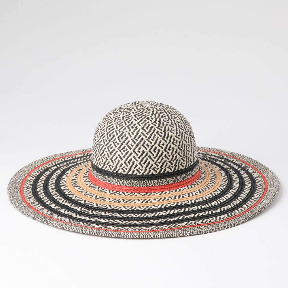 Sombrero de hebras tejidas con patrón de líneas, mezcla de colores y trenzado triangular en colores blanco crema, negro, rojo y café. Lleva cintas por el interior para ajustar su tamaño.