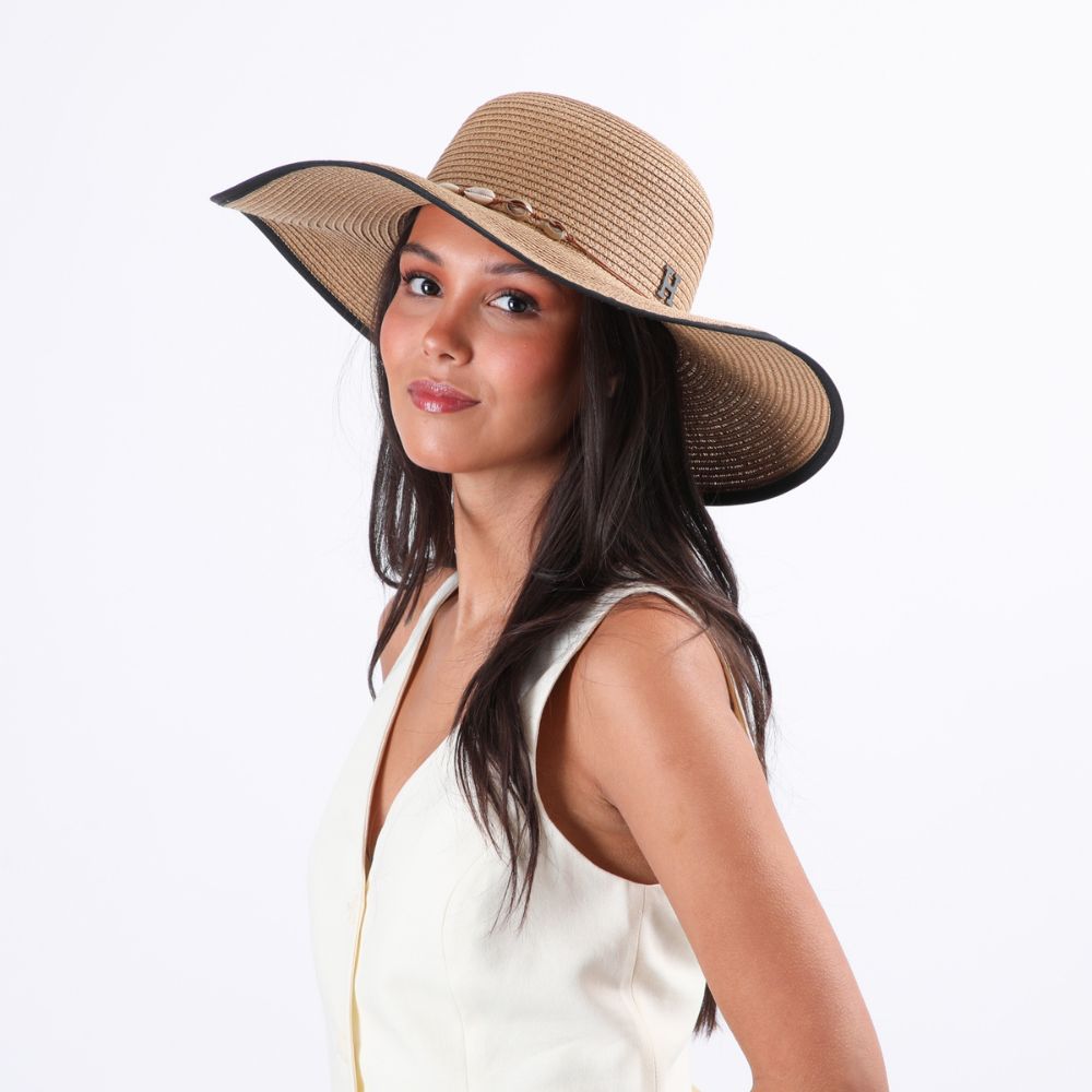 Sombrero de hebras tejidas café con borde negro y una correa de hilo encerado con 5 conchas de mar por el frente. Lleva cintas por el interior para ajustar su tamaño.