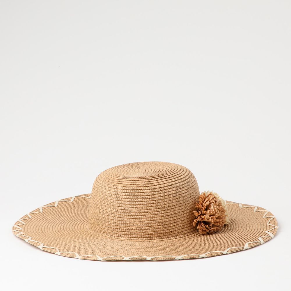 Sombrero beige ala larga con icono de la marca cosido al costado. Tiene dos pompones de papel al costado y en el borde un zig zag blanco. Tiene una cinta dentro que permite el ajuste a la cabeza.