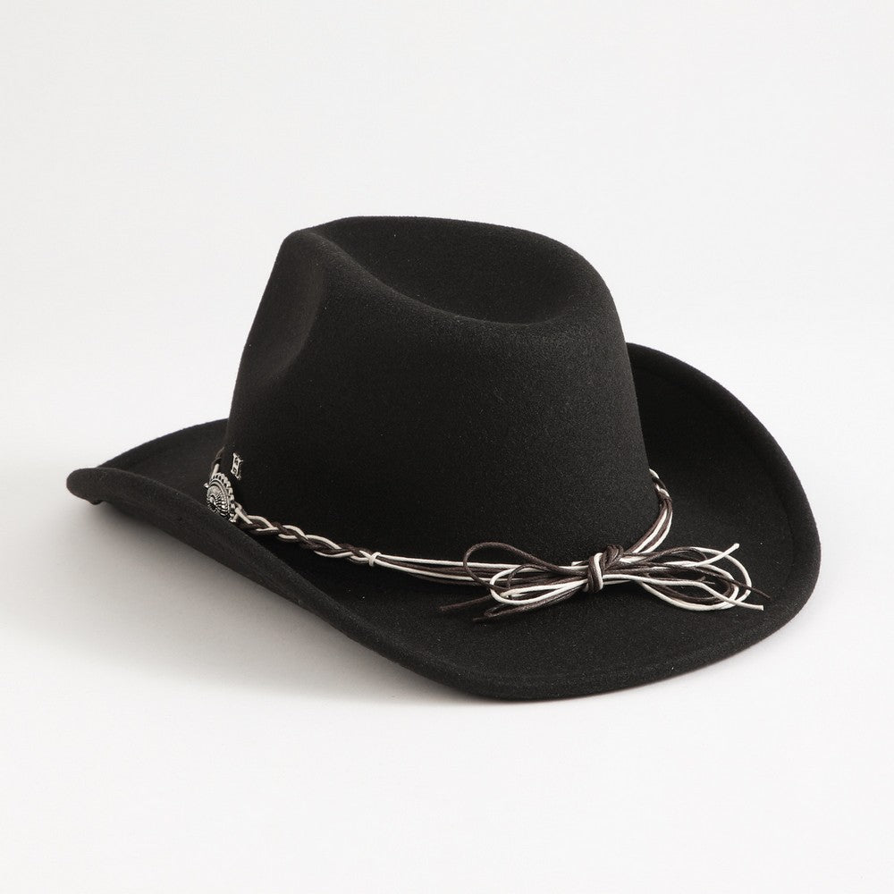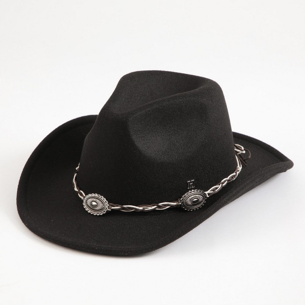 Sombrero en color negro, con cadena decorativa cordón tipo cuero alrededor de la copa y apliques metálicos. Un accesorio práctico y fácil de combinar, ideal para complementar distintos looks.