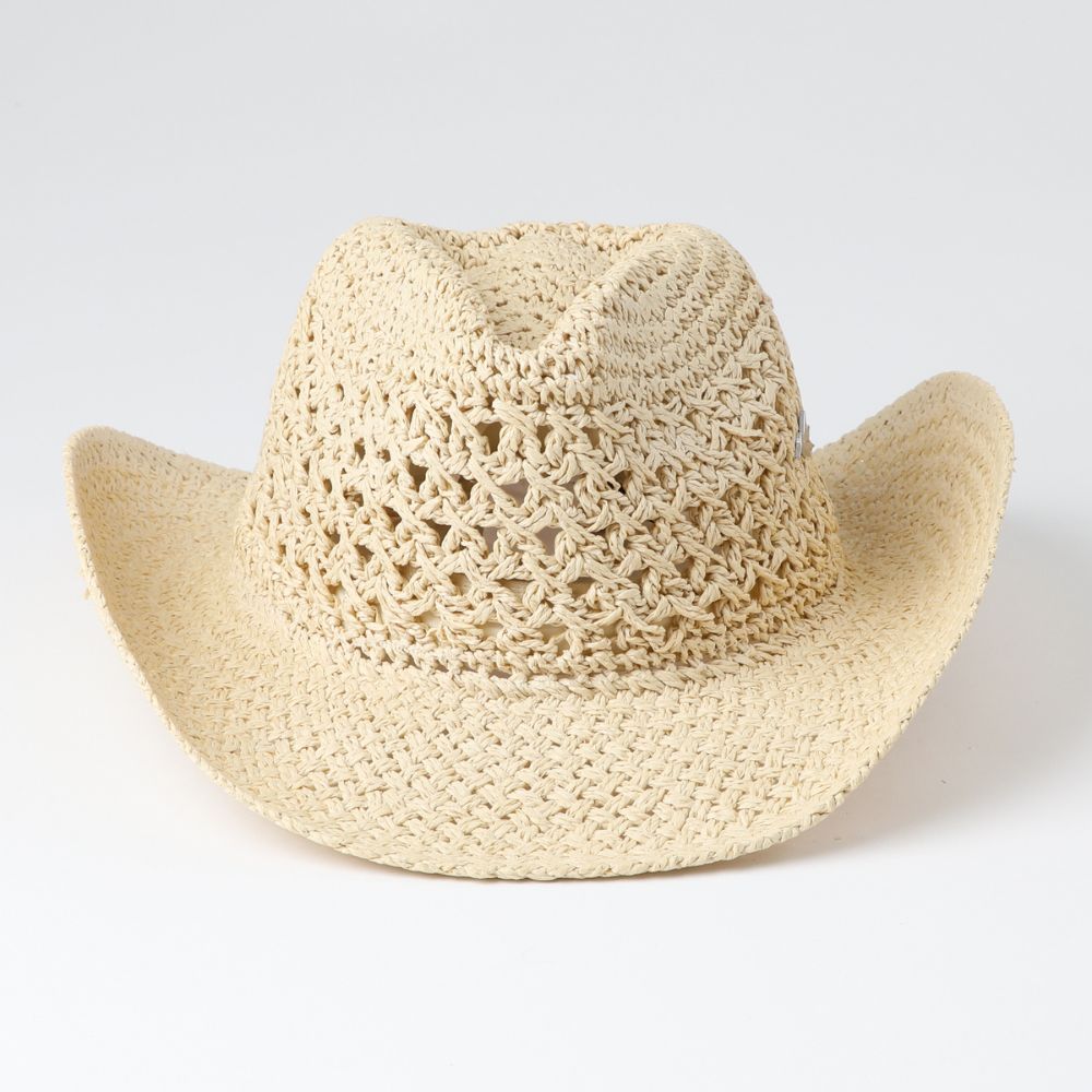 Sombrero tipo cowboy de hebras tejidas color beige claro. Lleva una cinta en su interior para ajustar su tamaño.