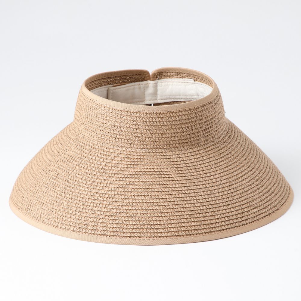 Visera de hebras tejidas color café claro con velcro y un elástico para enrollar/guardar. Lleva una cinta en su interior para ajustar su tamaño.