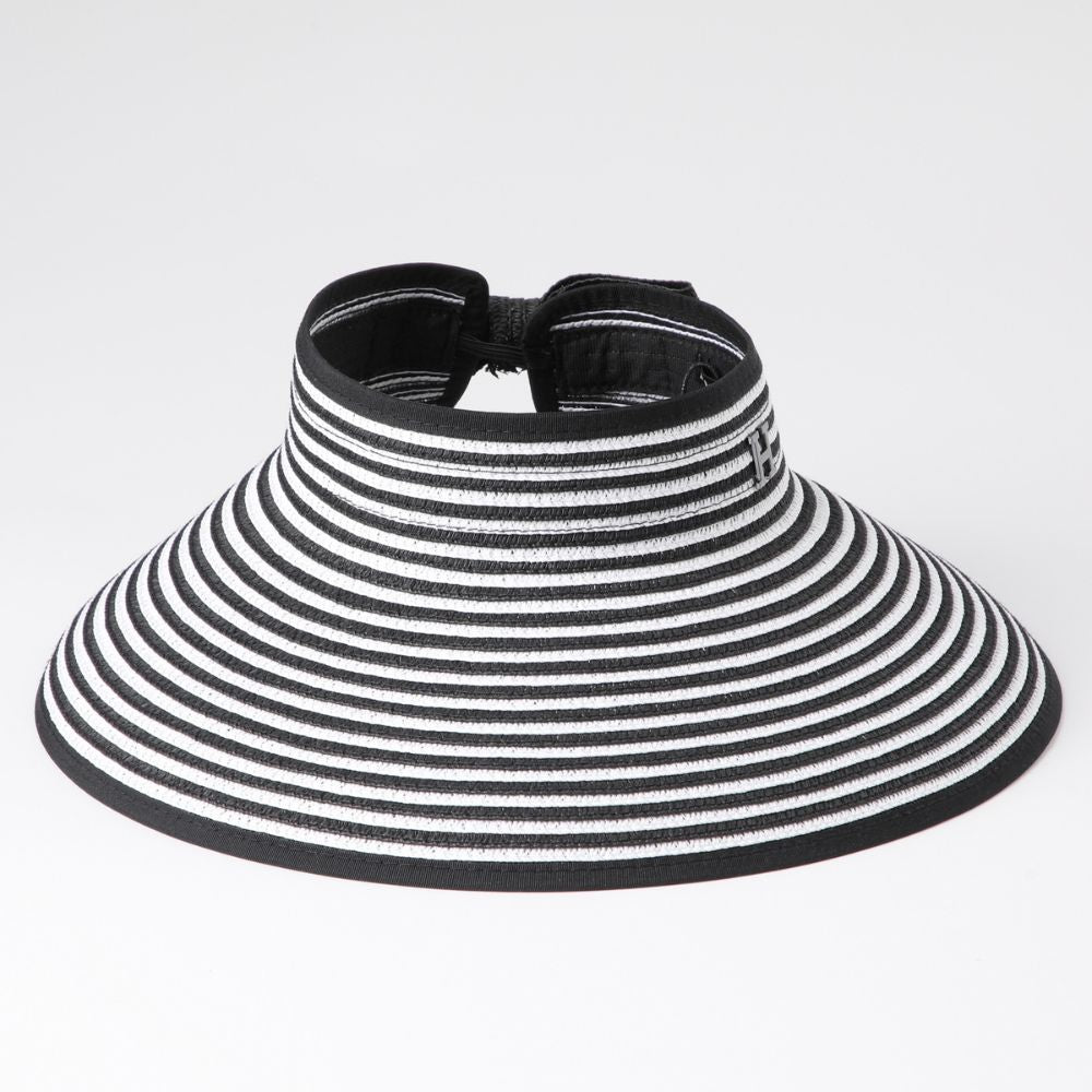 Visera de hebras tejidas en patrón de líneas negras y blancas. Lleva una cinta con velcro por el revés para cerrar/ajustar y un elástico para enrollar y guardar.