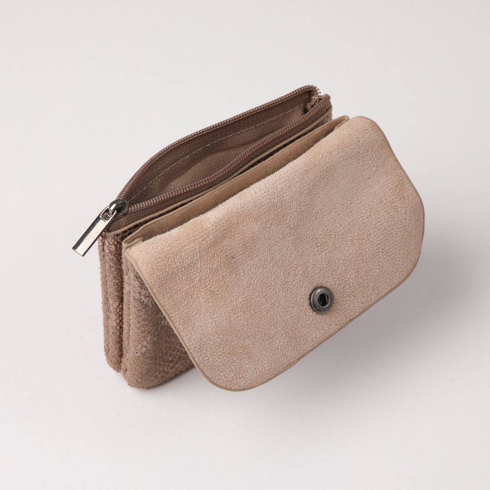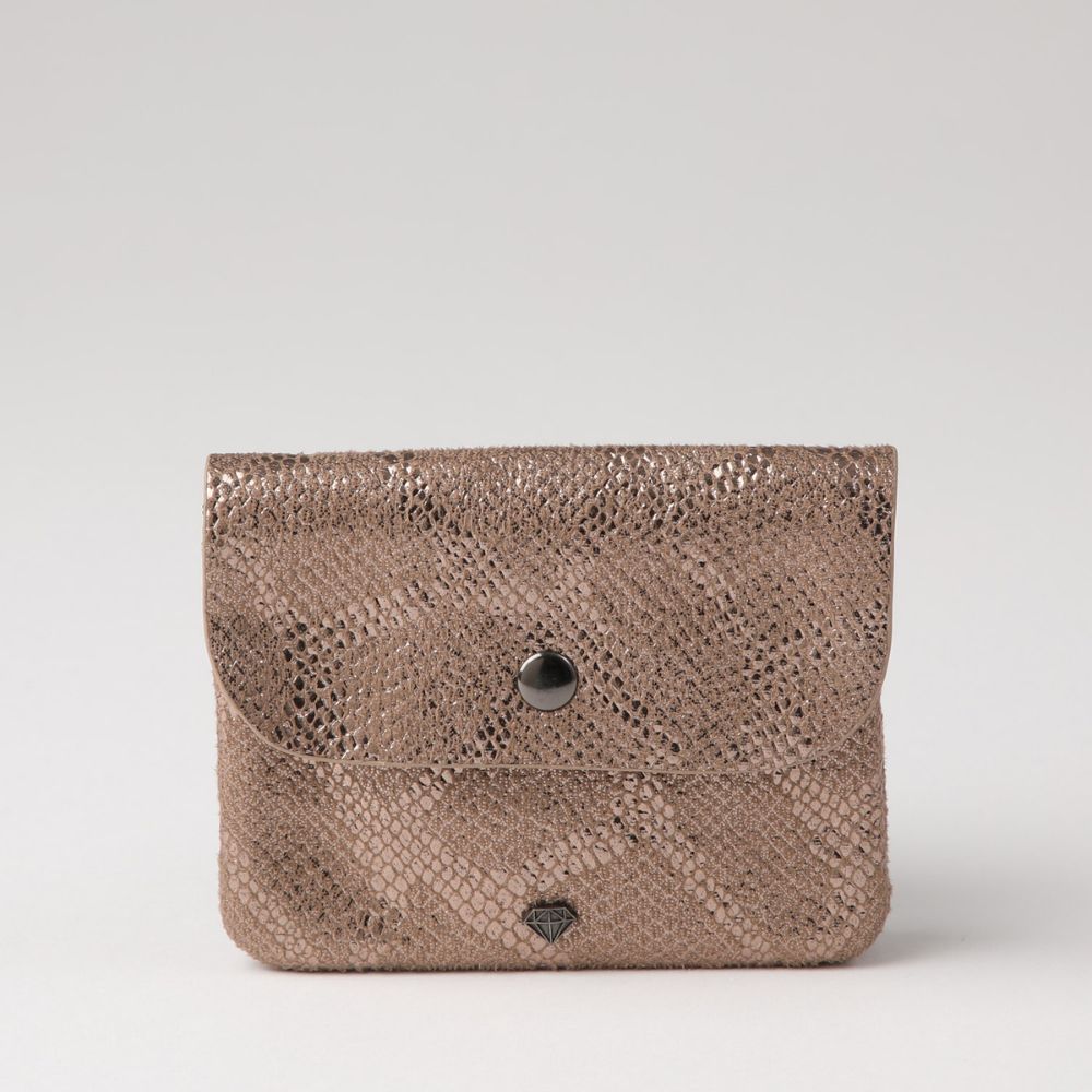 Tarjetero blando tela estampada serpìente beige con dorado.
