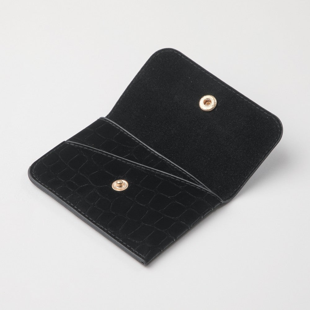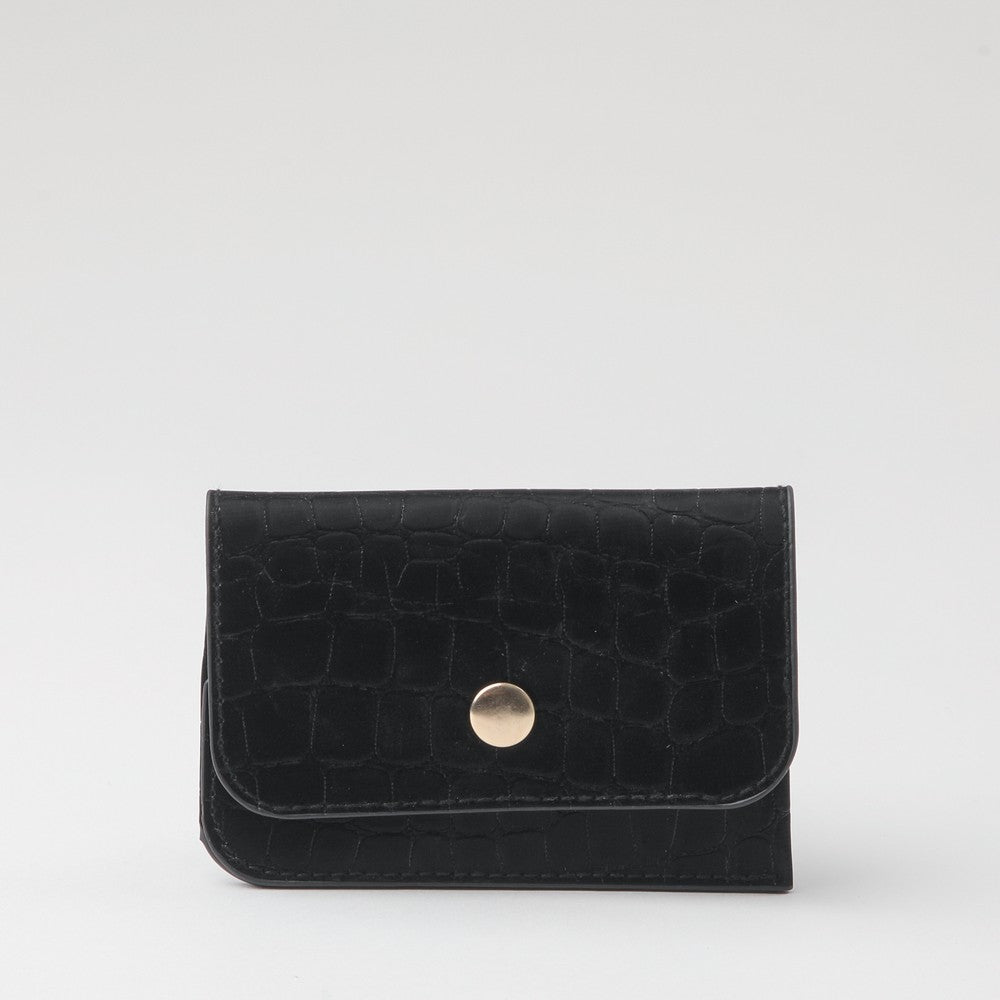 Tarjetero en ecocuero negro con textura tipo croco, de formato compacto y solapa con broche metálico. Incluye compartimento interior para tarjetas y cierre a presión. De uso práctico para llevar lo esencial en carteras pequeñas o bolsos de mano. Un diseño clásico y funcional.