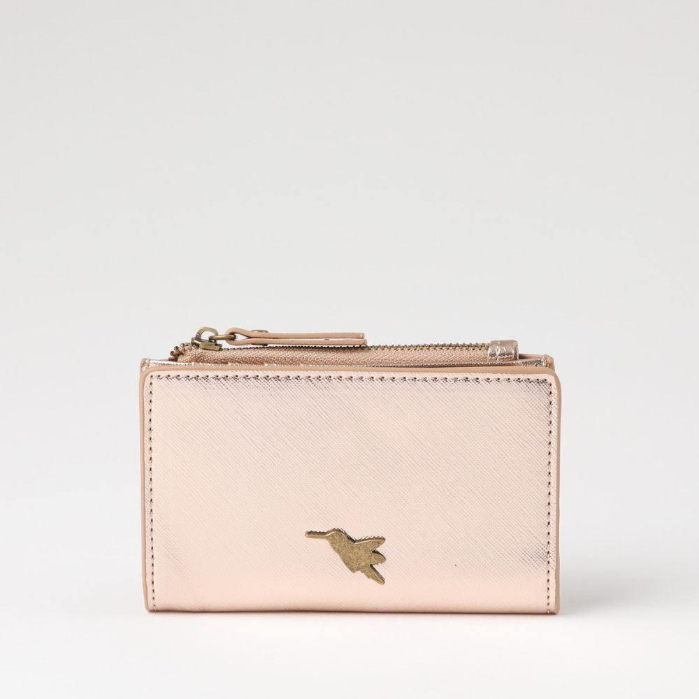 Tarjetero ecocuero dorado metalizado. Capacidad para 6 tarjetas y monedero con cierre.