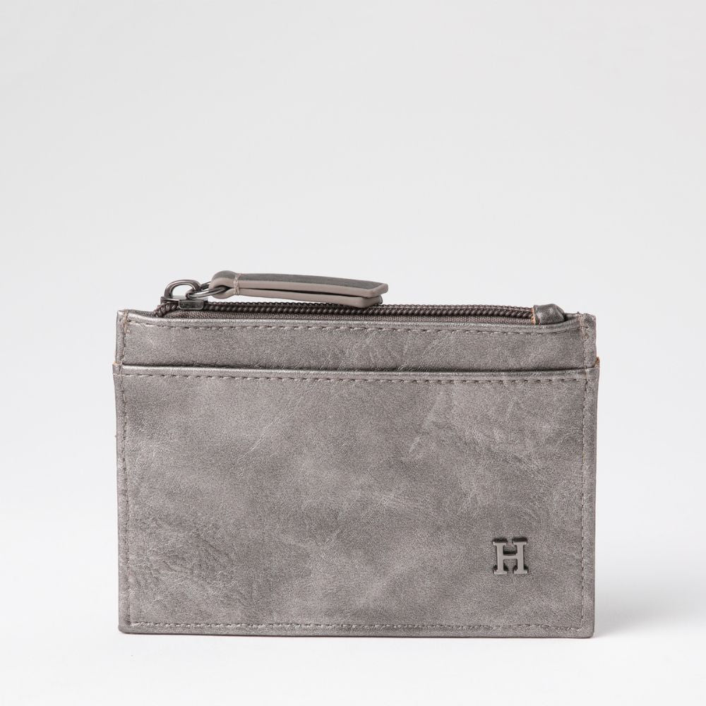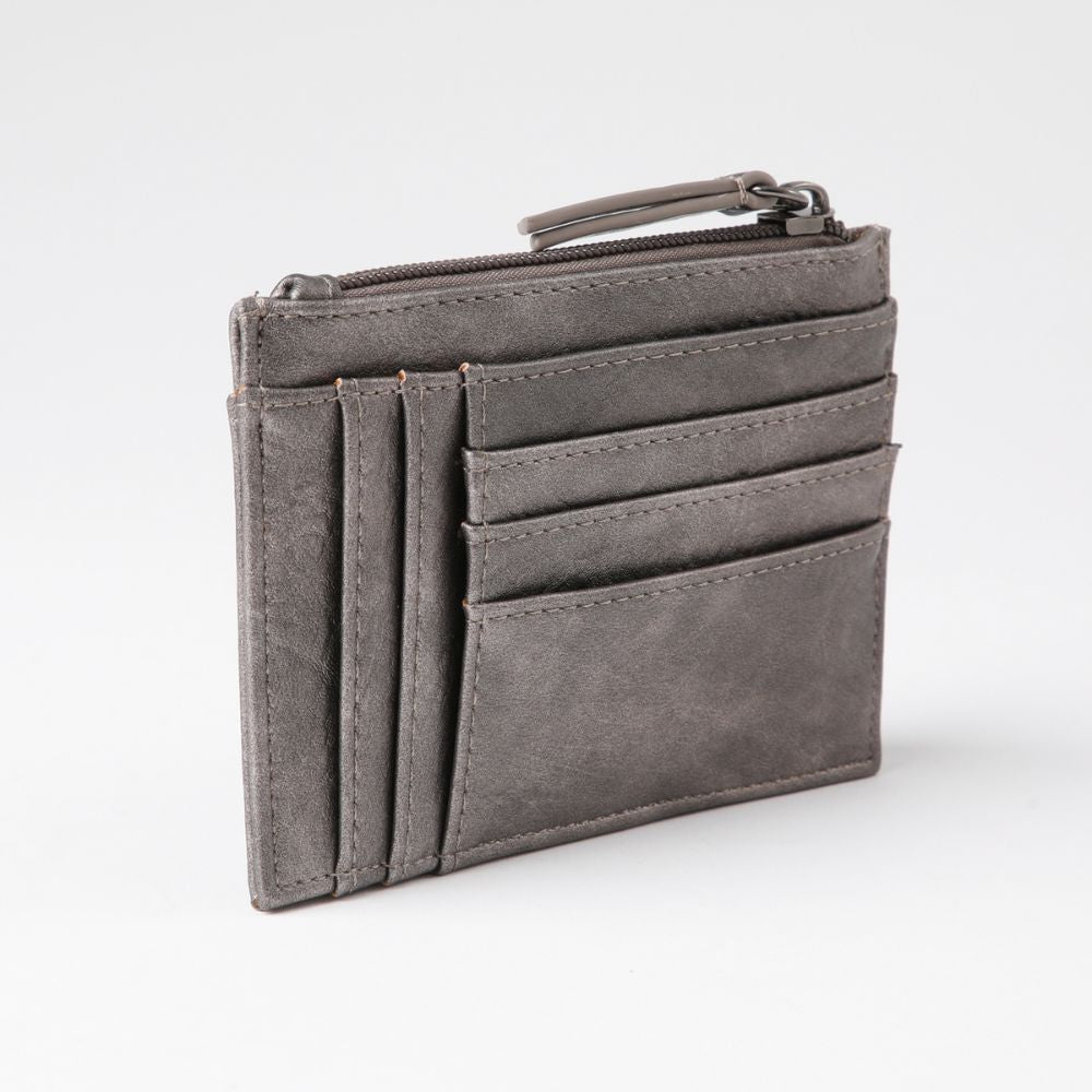 Tarjetero de ecocuero plateado oscuro con cierre y capacidad para 8 tarjetas.