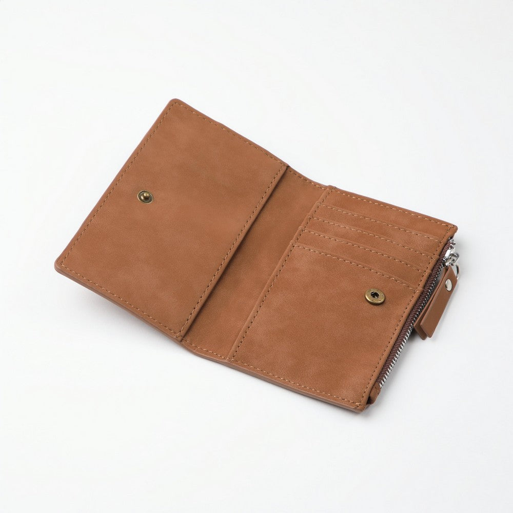 Tarjetero en tono café de formato compacto, con diseño liso y bolsillo principal con cierre. Ideal para llevar lo esencial de forma práctica.