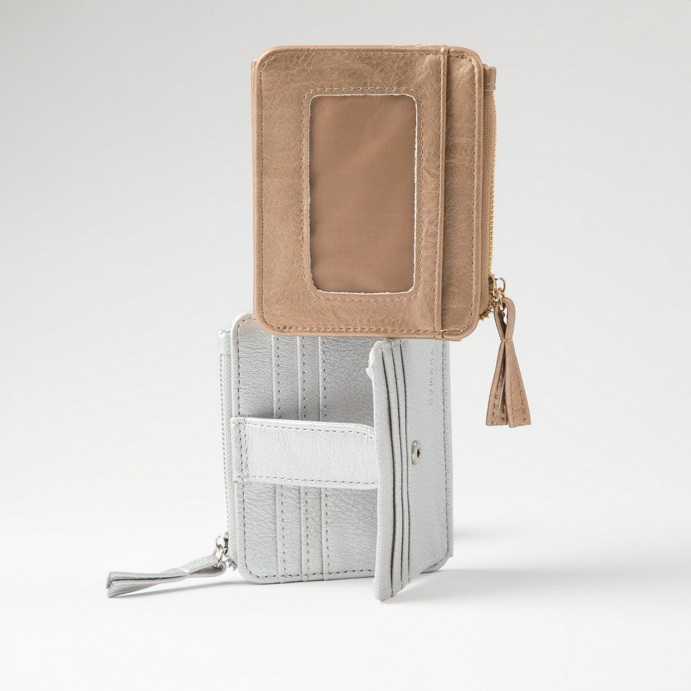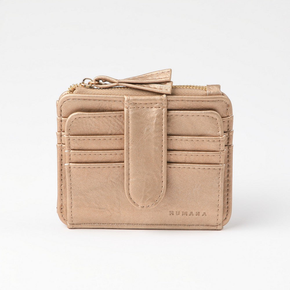 Tarjetero cuenta con cierre perimetral, compartimentos exteriores para tarjetas y una ventana transparente en la parte posterior. Logo de la marca estampado al frente.