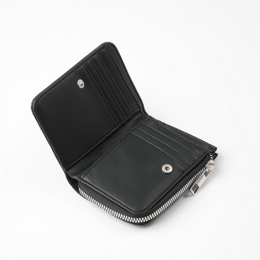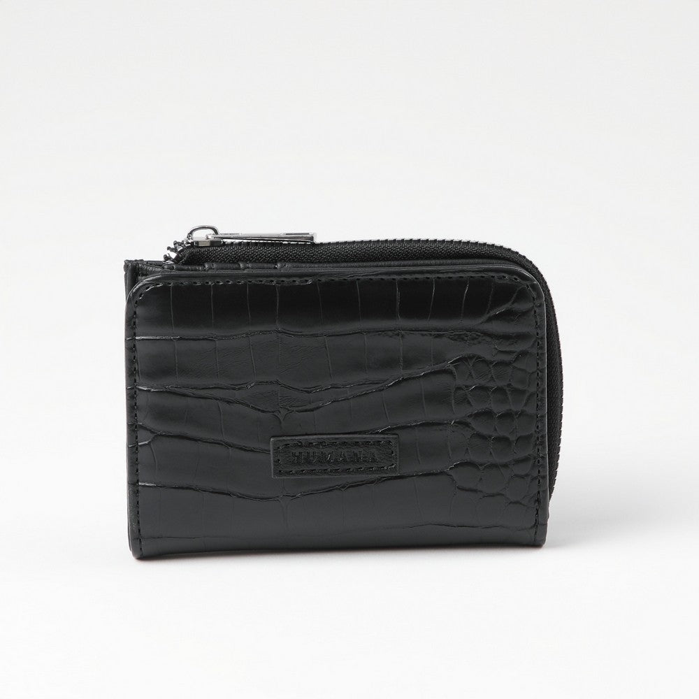 Tarjetero de color negro, con superficie texturada y logo de la marca aplicado al frente. Presenta cierre perimetral con cierre metálico y formato compacto, ideal para llevar dentro de bolsos o carteras.
