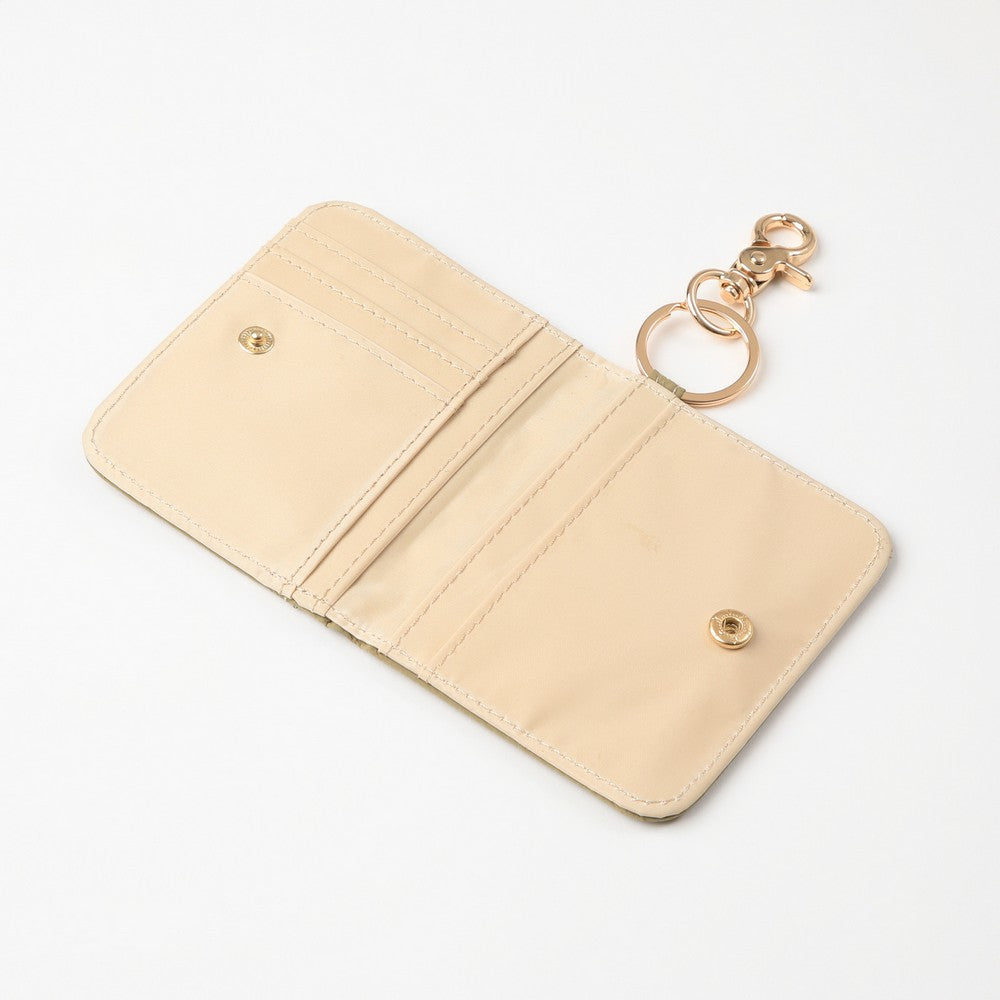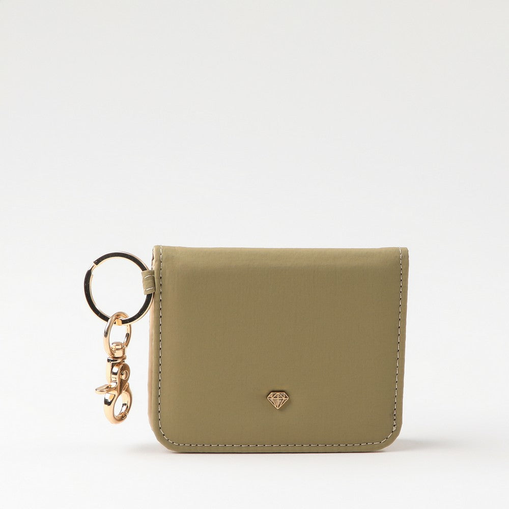 Tarjetero en tono verde, con logo metálico frontal. Incluye argolla y mosquetón metálico para llaves, y ventana transparente posterior para identificación. Diseño práctico y liviano para llevar lo esencial.