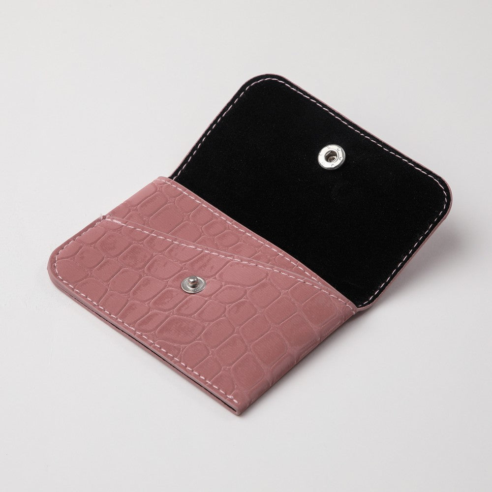 Tarjetero en ecocuero rosado con textura tipo croco, de formato compacto y solapa con broche metálico. Incluye compartimento interior para tarjetas y cierre a presión. De uso práctico para llevar lo esencial en carteras pequeñas o bolsos de mano. Un diseño clásico y funcional.
